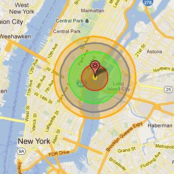 This nuke map considers what would happen if Iran exploded a 20 kiloton nuclear bomb on a ship beside the U.N. Headquarters in New York City. The blast radius affects Manhattan, Brooklyn, and Queens.