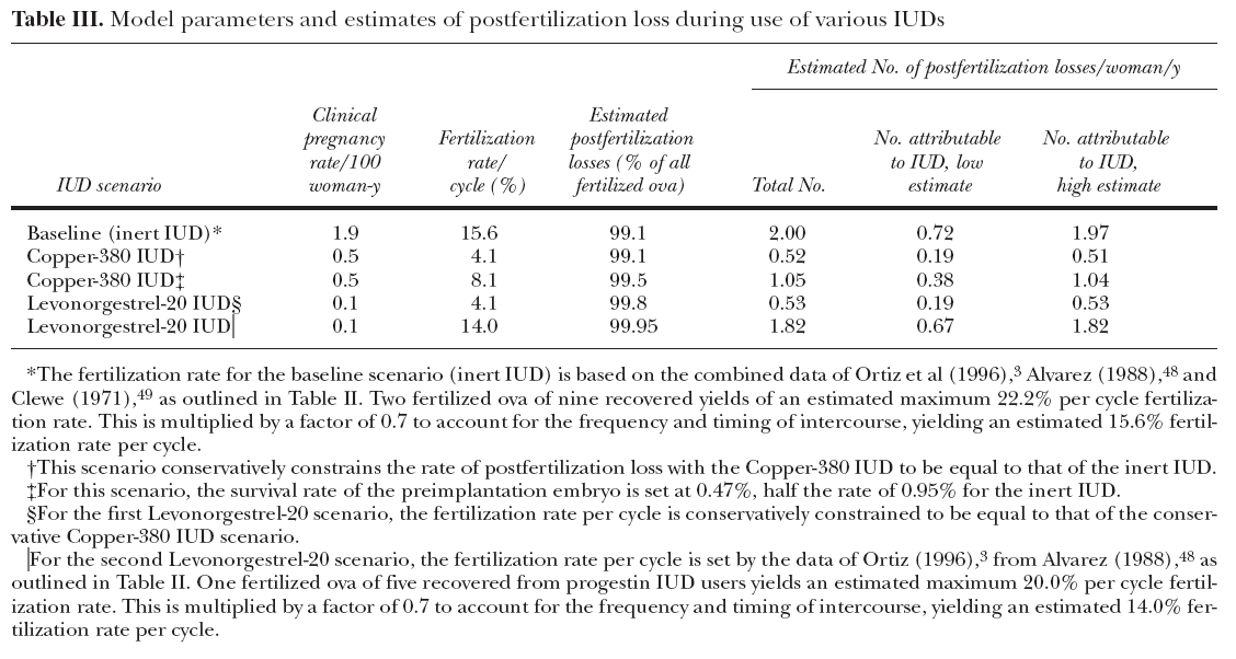 The fertilization rate per cycle tells us how often two things happen together: the contraceptive action of the IUD fails and conception also occurs. How can the clinical pregnancy rate be so low per year, when the fertilization rate, for women using IUDs, is so high? The answer is found in the “Estimated postfertilization losses (% of all fertilized ova)” [1. Table III]. This figure exceeds 99% for all IUDs and scenarios. In other words, IUDs are not especially effective as contraceptives, but they are very effective as abortifacients. In almost all cases, when fertilization occurs, the conceived prenatal does not survive.