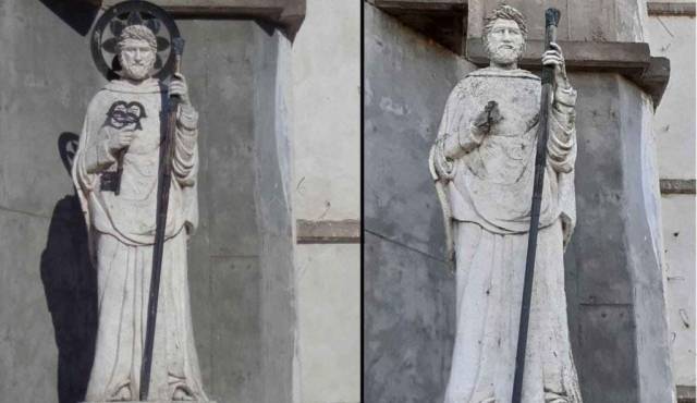 Carlos states that the statue was struck by lightning, which damaged the right hand and the key of the Saint Peter statue (See the photo confirmation here). Ben Carter claims the Halo was destroyed also, but other sources with photo (below) show that the Halo was removed prior to the now confirmed lightning strike.